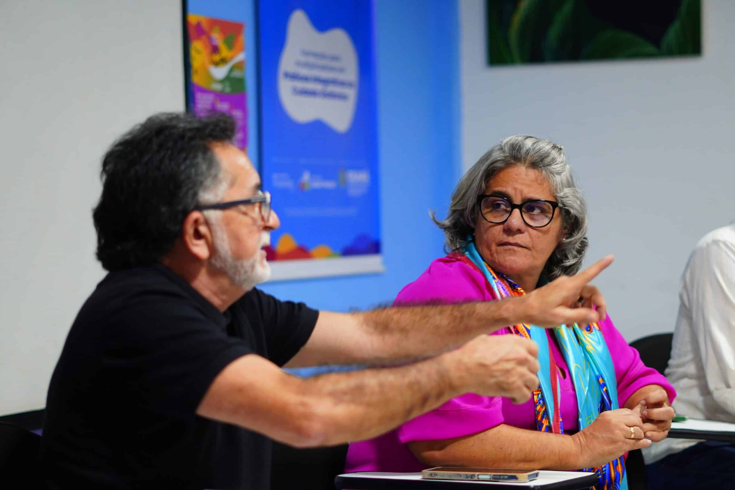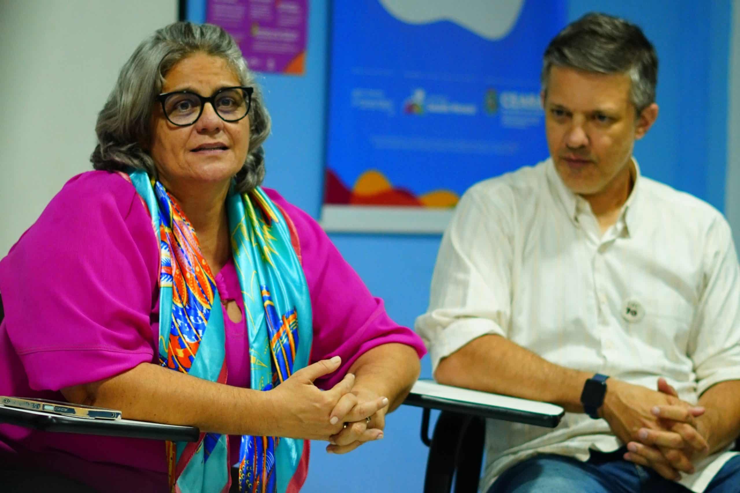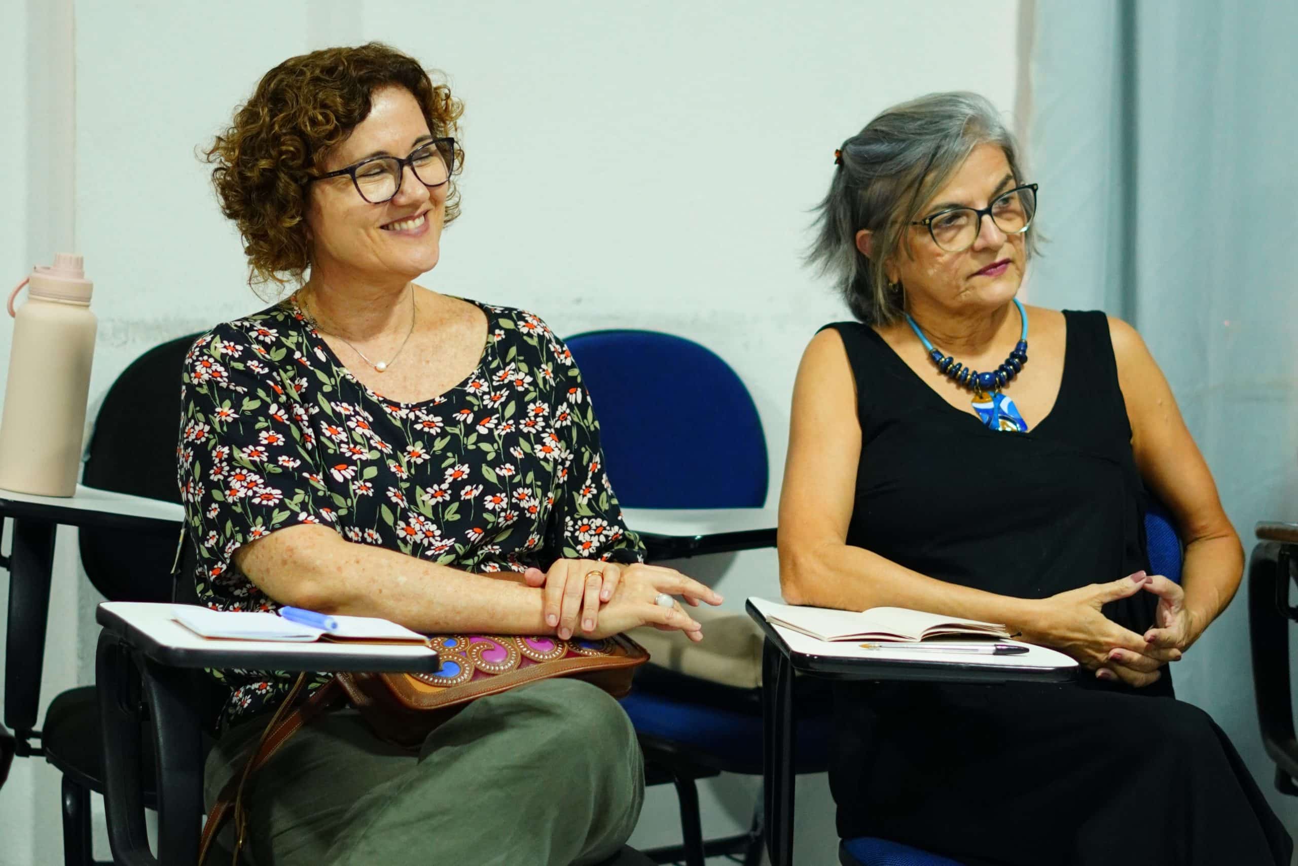 (Pró-reitora de Extensão Bernadete e Prof. Estevão Fernandes dialogam com equipe do Movimento Saúde Mental / Foto: Yago Medina)