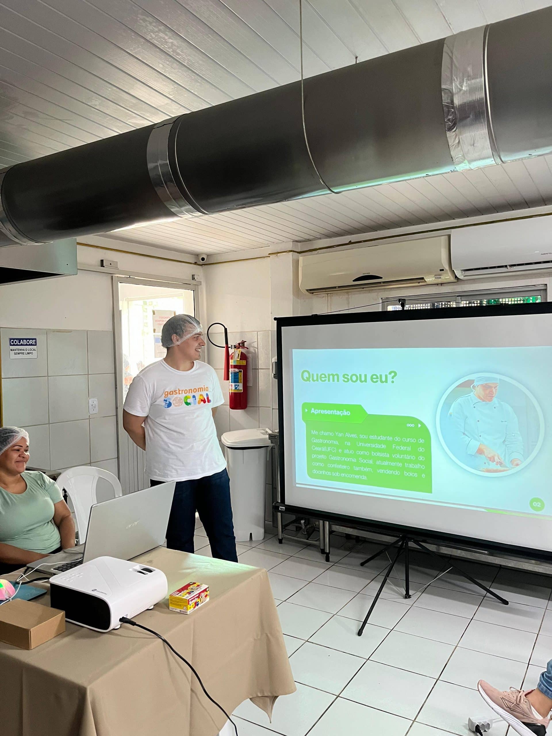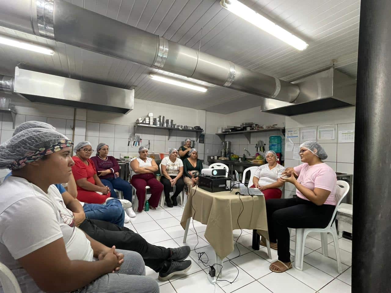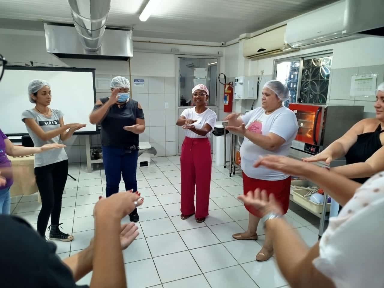 As aulas ainda contaram com exercícios práticos, quando os/as participantes sujaram as mãos e aprenderam a lavá-las corretamente, além da execução de procedimentos operacionais padronizados, executando a limpeza de liquidificadores, batedeiras, bancadas, fogões e placas de corte.