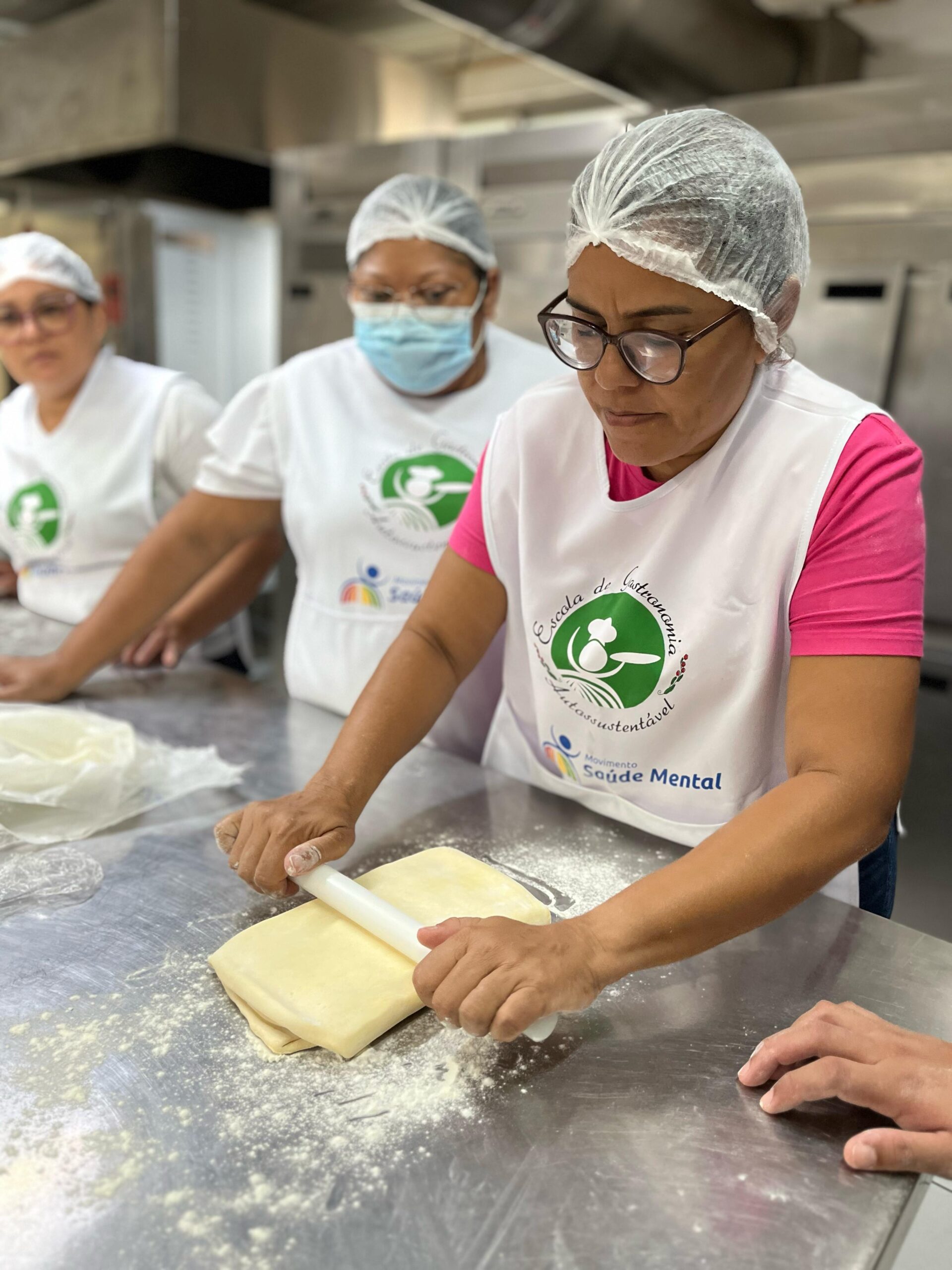 Juntamente às aulas de gastronomia, são realizados momentos de relaxamento e autocuidado com os/as terapeutas da Palhoça Comunitária do Movimento Saúde Mental, que atuam em conjunto com as formações gastronômicas no desenvolvimento pessoal dos/as participantes.