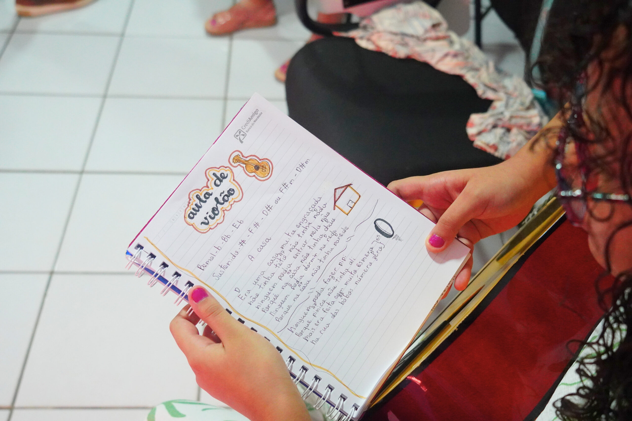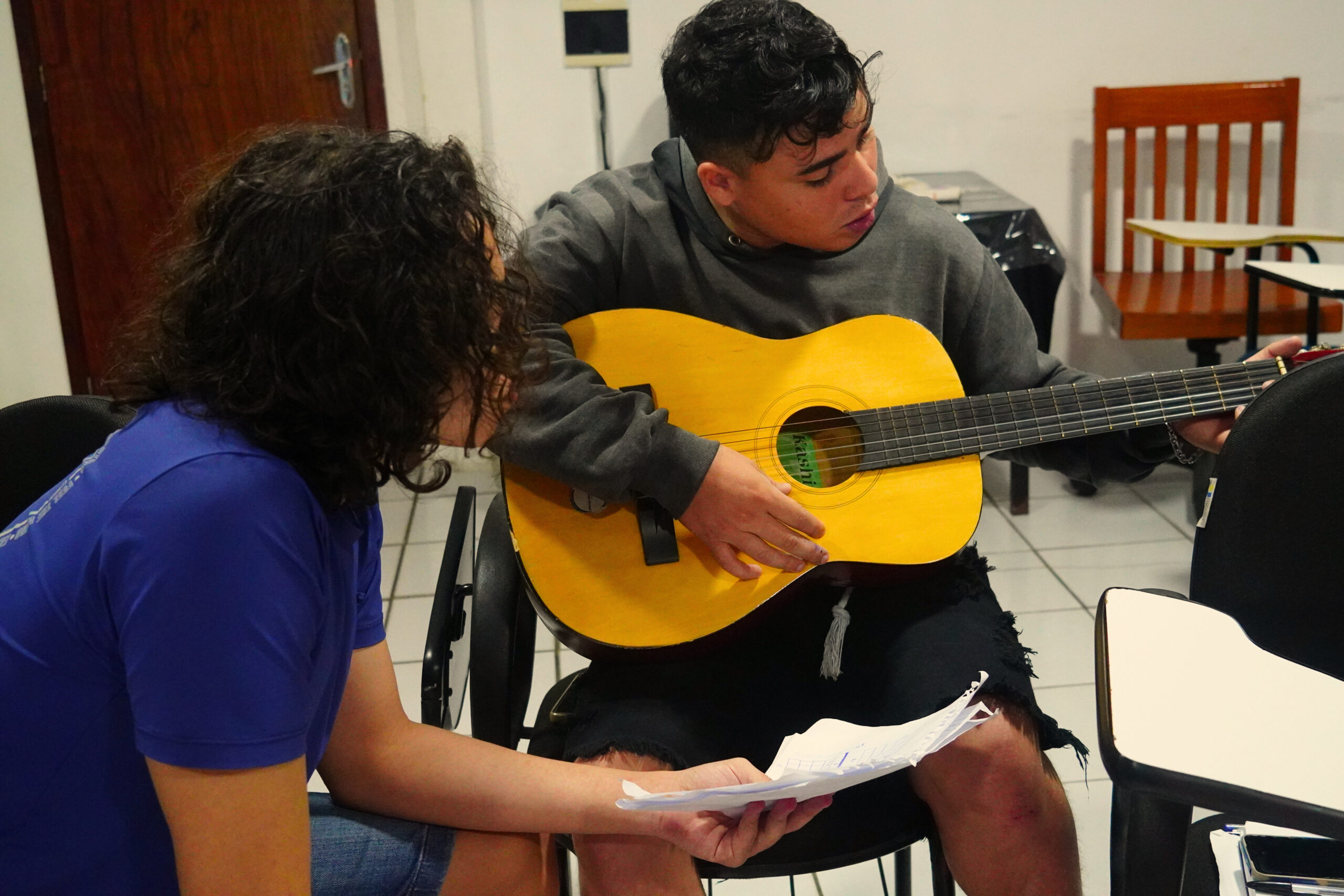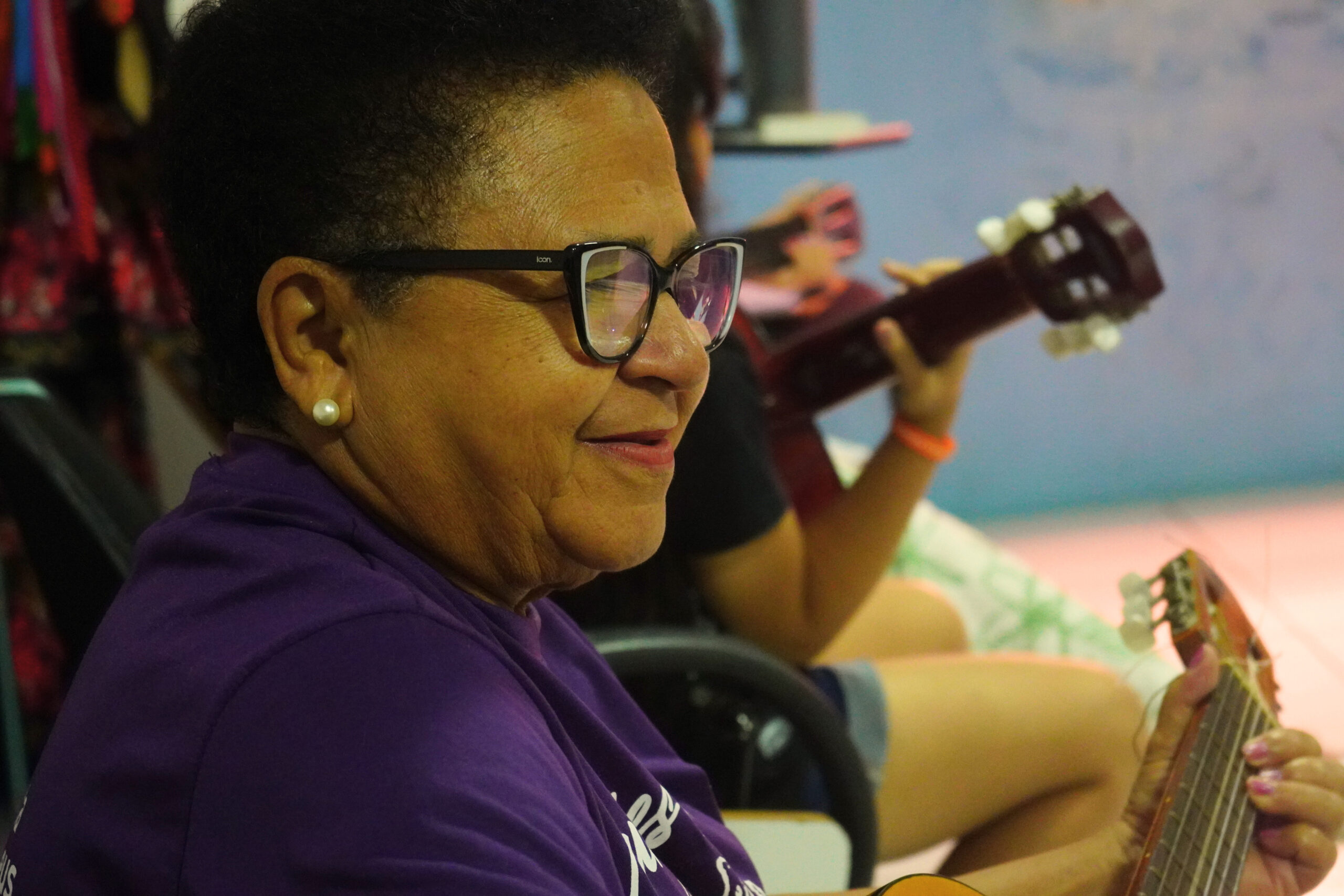 O grupo engajado e cheio de curiosidade se reúne no auditório da Casa AME nas manhãs de quarta-feira para aprender as técnicas do violão e desenvolver a memória e concentração a partir dessa atividade, que além de divertida tem grande potencial terapêutico. No exercício dessa atividade em grupo não é difícil notar as duplas que se ajudam e trocam conhecimentos. Quem já domina um certo acorde logo se prontifica a estender a mão e ajudar a posicionar corretamente a do/a colega.