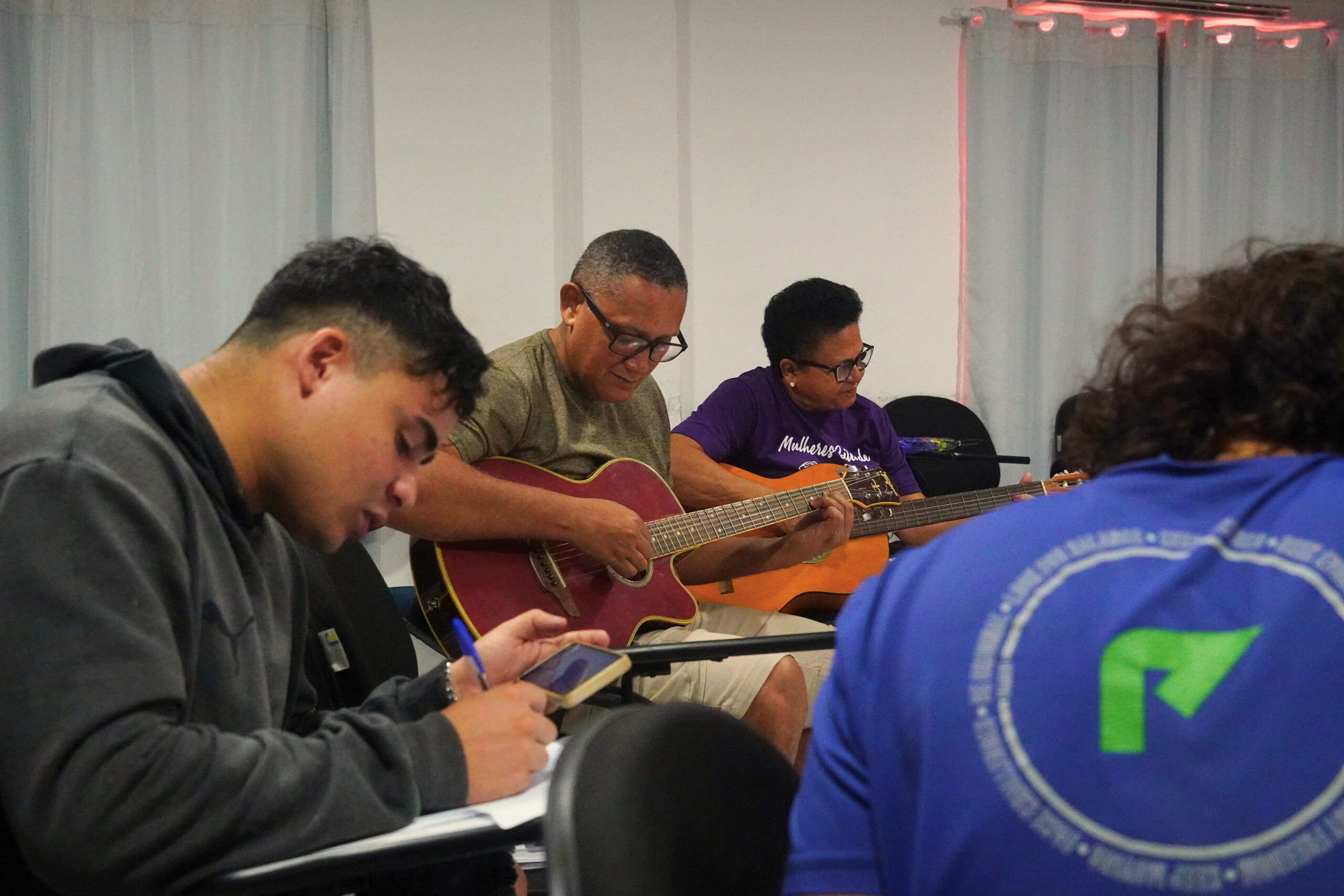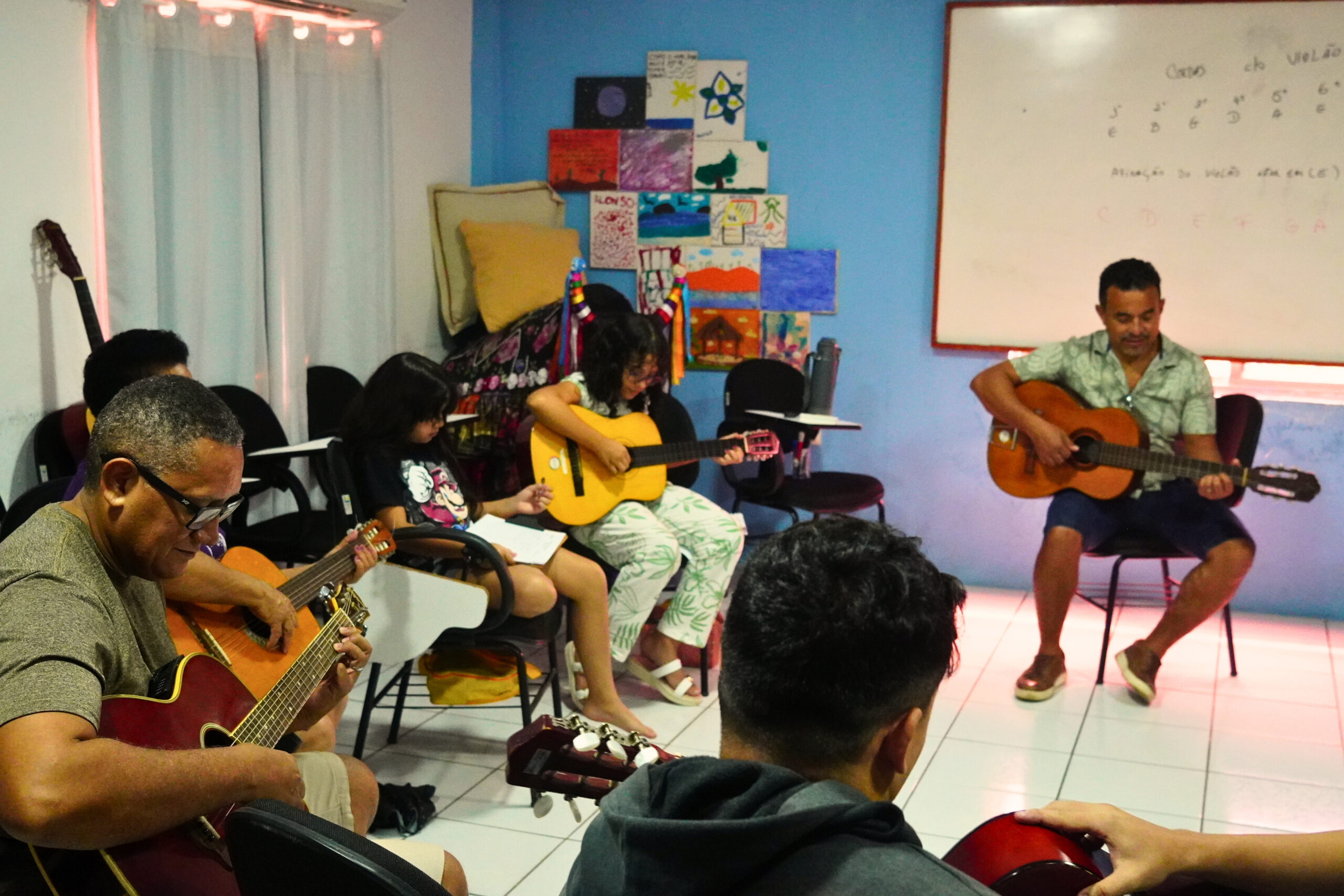 A Oficina de Violão é uma das atividades da Casa AME (Arte, Música e Espetáculo). Iniciada em março deste ano, conta com 15 alunos/as que são orientados/as pelo músico e compositor Tony Souza, parceiro do Movimento Saúde Mental desde 2018. A oficina tem ajudado a formar musicalmente, crianças, jovens e adultos que buscam um primeiro contato ou o aprimoramento das técnicas com o instrumento.