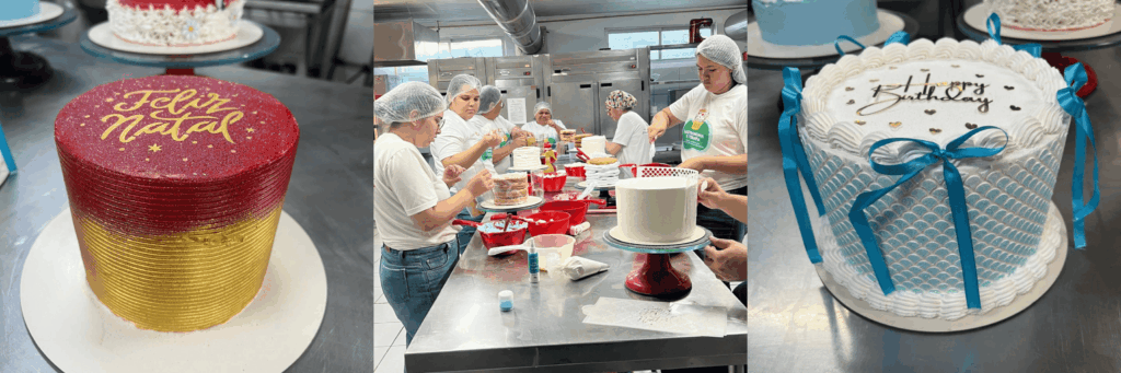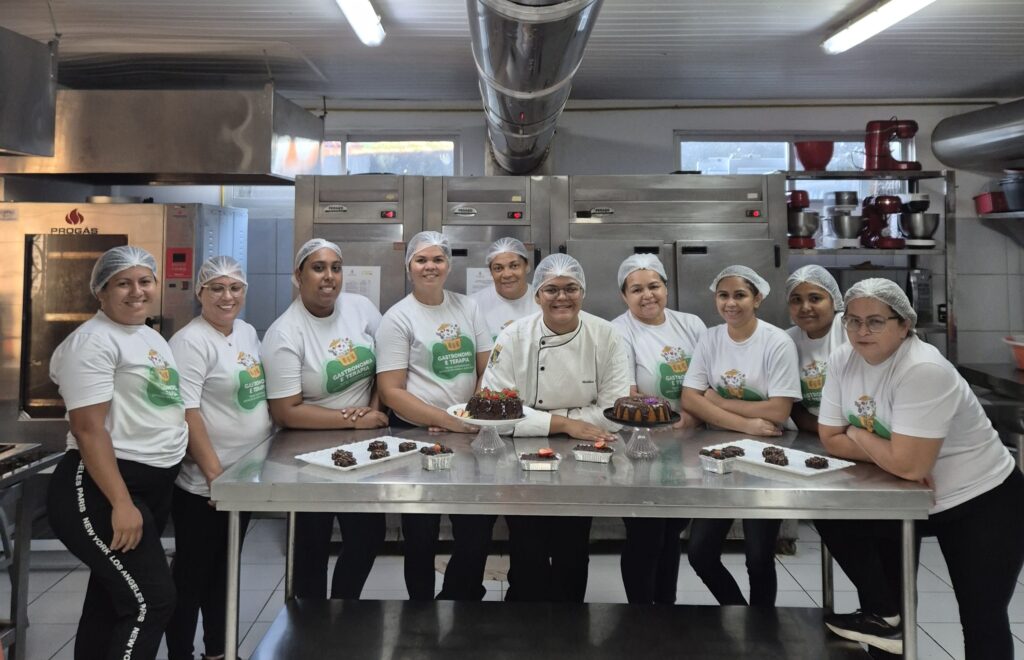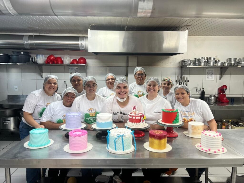 Já a turma de Chocolateria finalizou o mês com o preparo de bolos confeitados. Na aula do dia 29/10, a professora Lauana Fontenele, junto com Yan Alves – professor do curso Doces e Salgados Comerciais – ensinaram espatulagem em chantininho, e os/as participantes puderam explorar a criatividade na decoração do bolo.