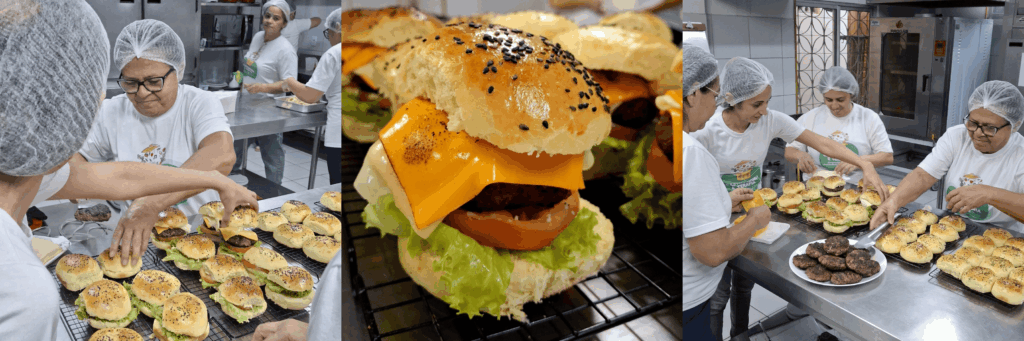 A turma de Salgados Comerciais, curso do projeto Gastronomia e Terapia, foi destaque da última semana de atividades em outubro na Escola de Gastronomia Autossustentável (EGA). No dia 28/10, o professor Joel Andrade ministrou aula sobre hambúrgueres artesanais, onde os/as alunos/as puderam aprender as técnicas necessárias para reproduzir a receita. O preparo incluiu a produção da massa brioche e da carne, feitos artesanalmente, além da montagem do hambúrguer.