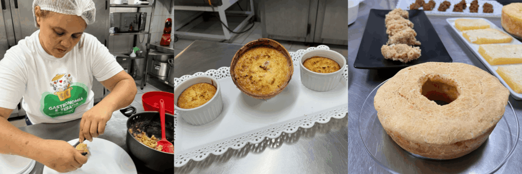 Em Doces e Sobremesas para Festa, a turma aprendeu mais sobre a doçaria nordestina e brasileira. Comandada pelo professor Yan Alves, a aula do dia 31/10 apresentou os aspectos históricos e contou com o preparo das receitas: cocadas tradicionais, morenas e de maracujá, cocada de forno, doce de leite, ambrosia, bolo de grude, bolo de goma e mungunzá.