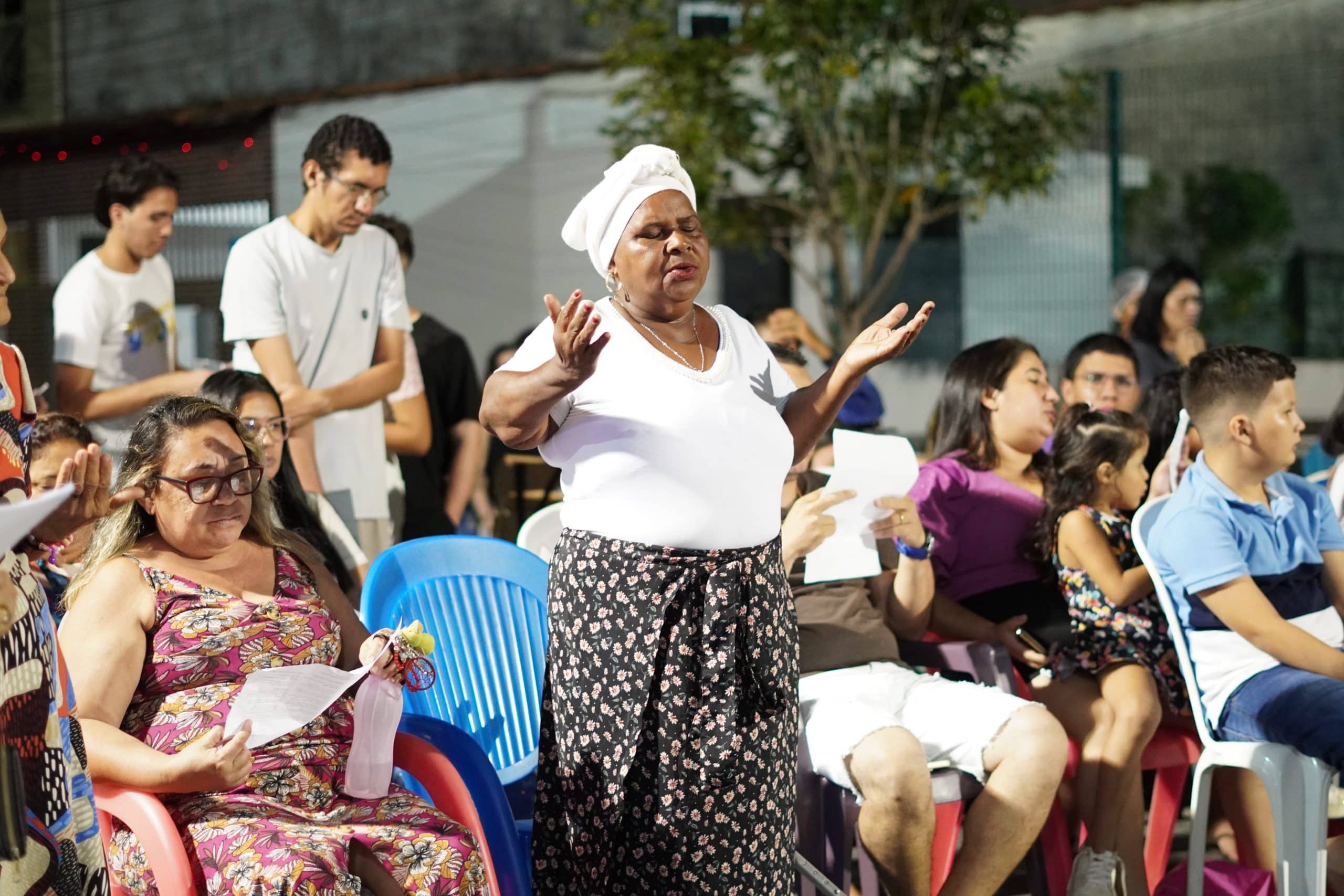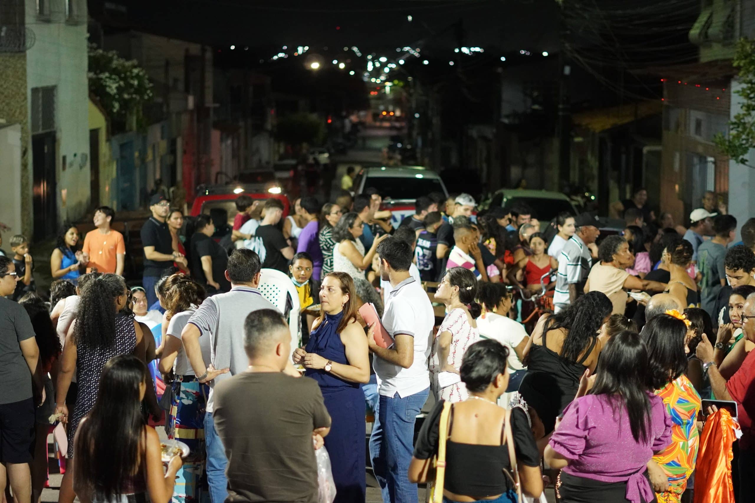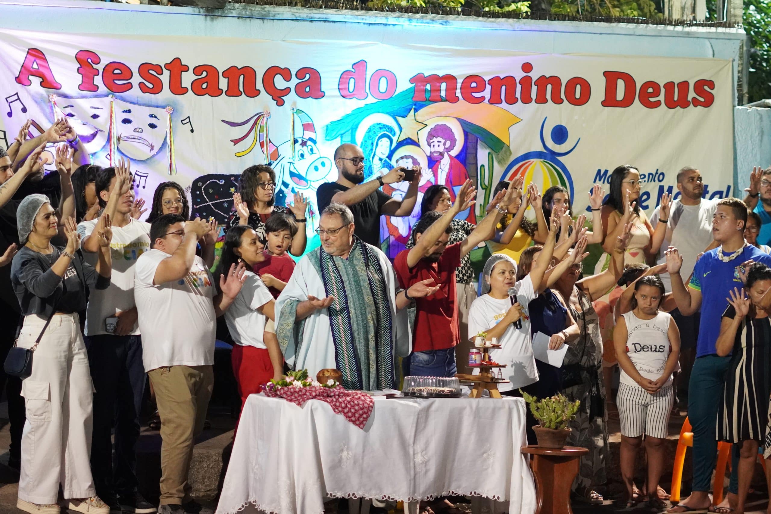 A Casa AME (Arte, Música e Espetáculo) mobilizou e coordenou um evento que ocupou uma porção da rua Dr. Fernando Augusto, no dia 22 de dezembro, no bairro Bom Jardim, em Fortaleza. O ato reuniu uma celebração ecumênica, conduzida por Padre Rino, nela foi inserido um auto de natal. Aquele foi um momento para refletir sobre a realidade atual e como o menino-Deus está presente em cada família. Ao final, foi também uma oportunidade para abraços solidários, confraternização e agradecimento pelas conquistas do ano de 2023.