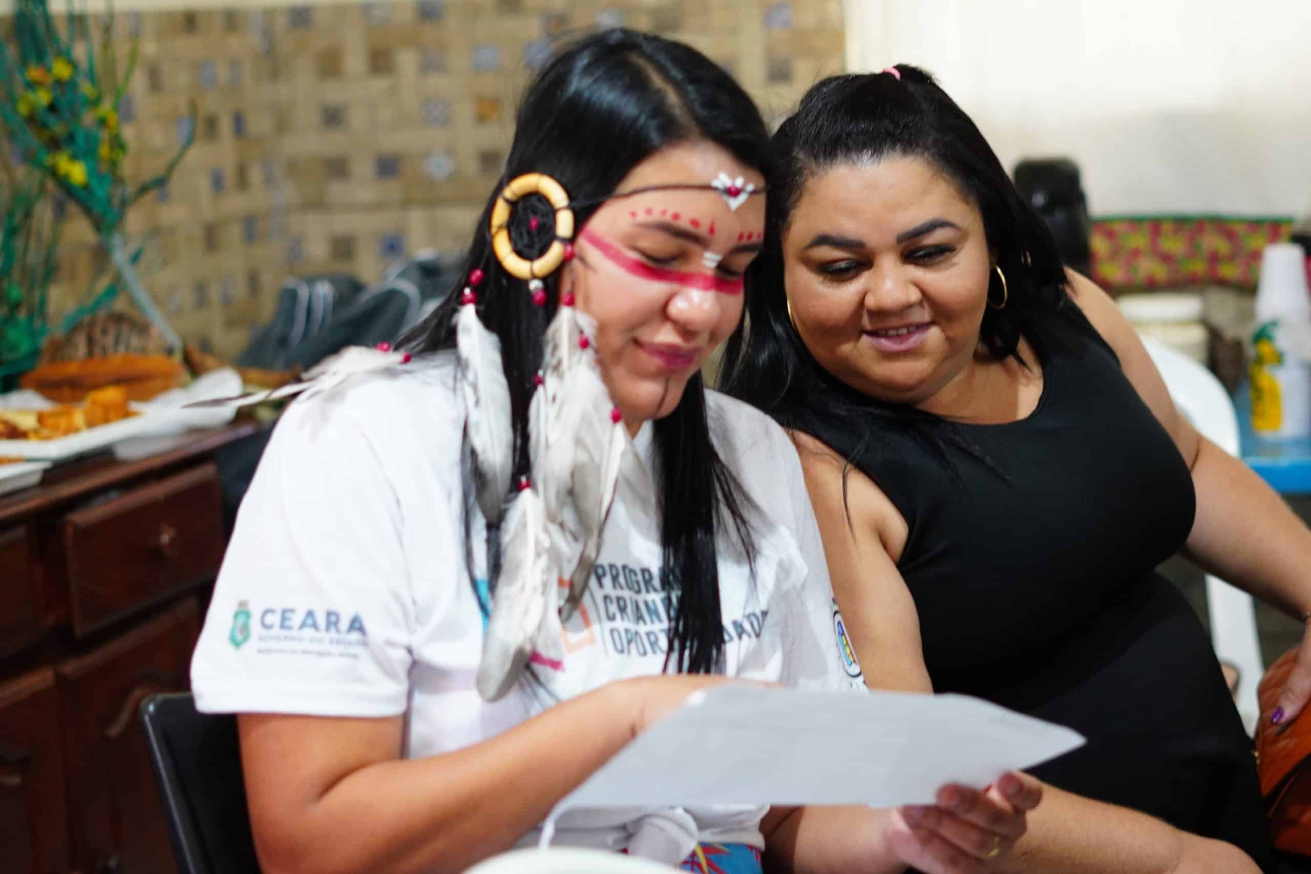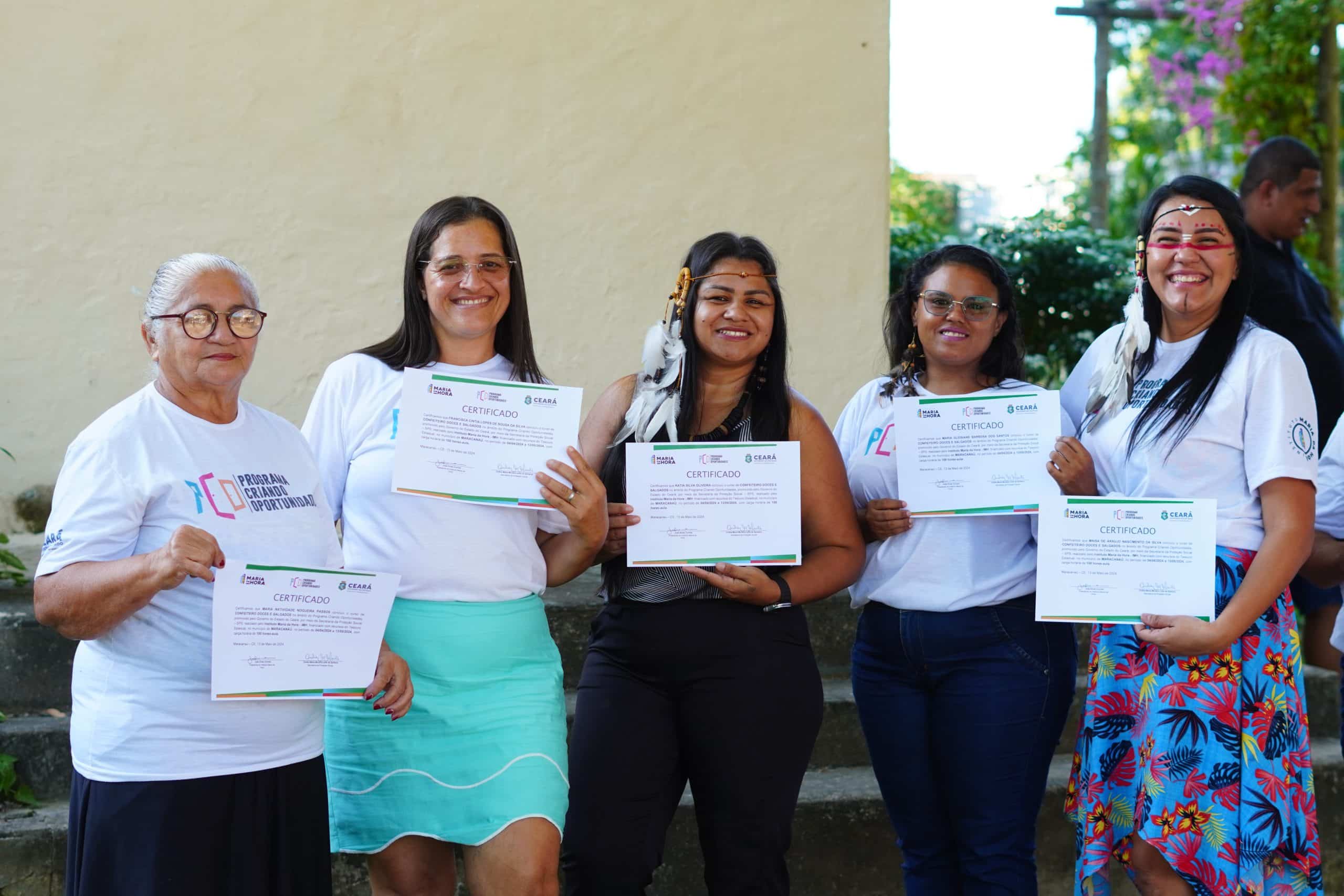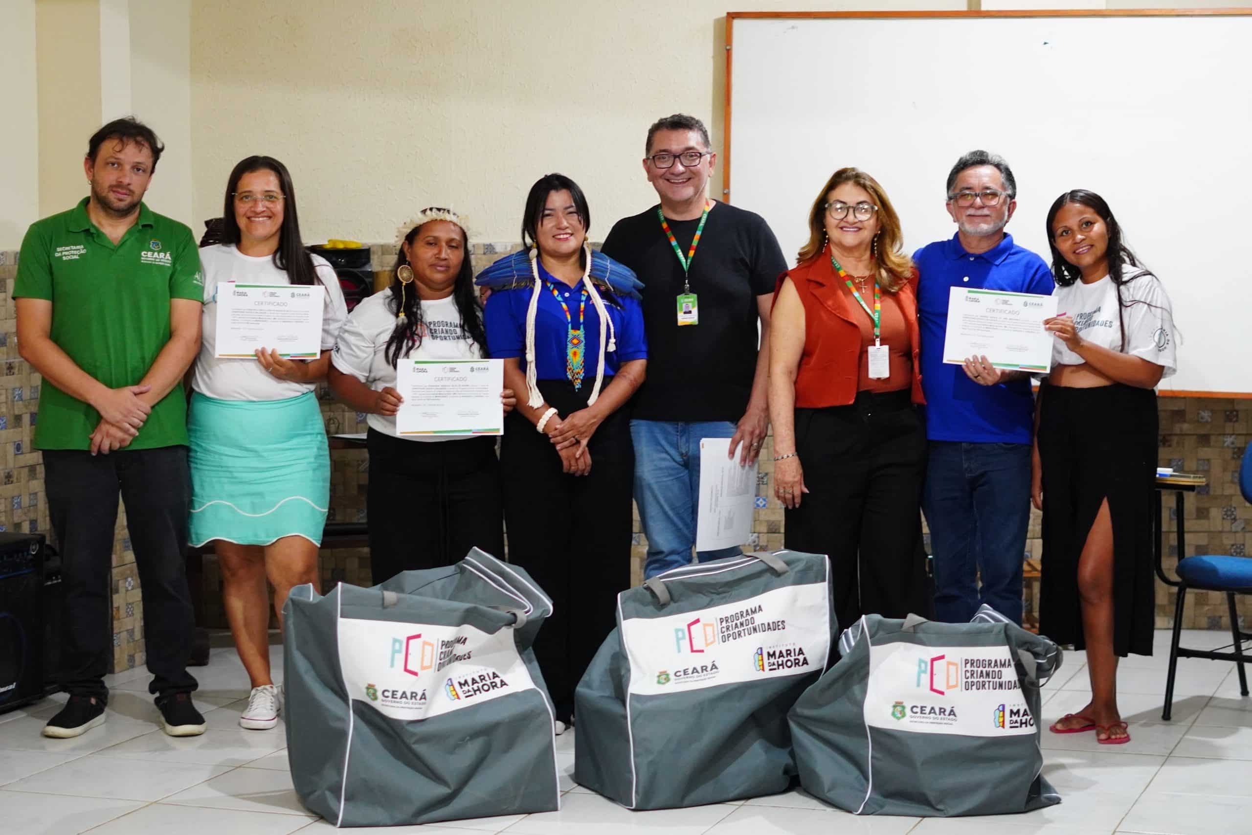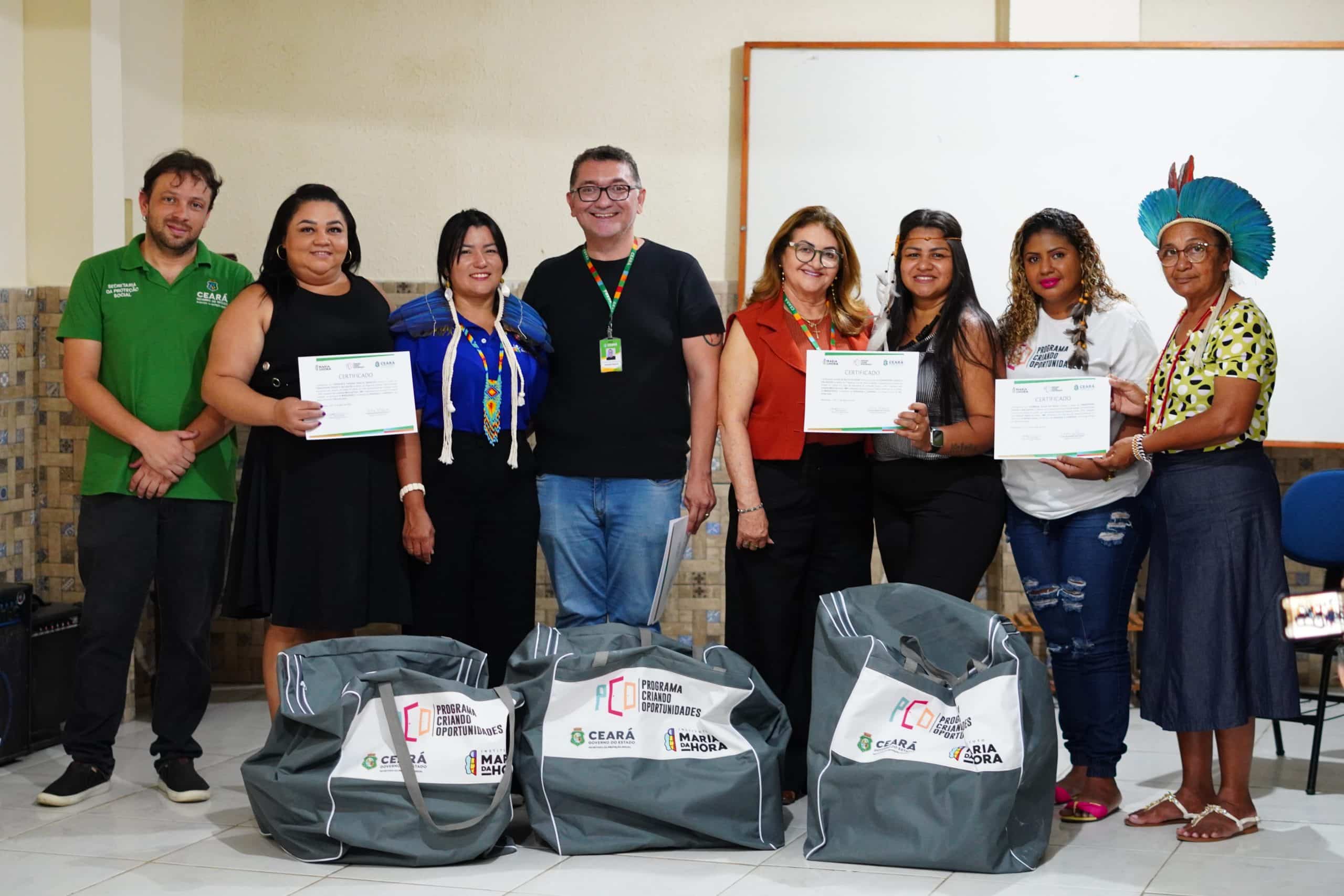 A solenidade para a entrega dos kits aconteceu no Sítio Wopila, em Maracanaú, e contou com a participação de representantes da Secretaria da Proteção Social – Luciene Guimarães, Ricardo Mariz e Wanderley de Castro -, do Movimento Saúde Mental – Elizeu Sousa, coordenador do MSM, e Luana Santos, coordenadora do projeto Sim à Vida Maracanaú -, do Instituto Maria da Hora – Ana Márcia -, além de lideranças indígenas do povo Pitaguary – Cacique Madalena, Neto Pitaguary, Mara Araújo e Nazinha Pitaguary.