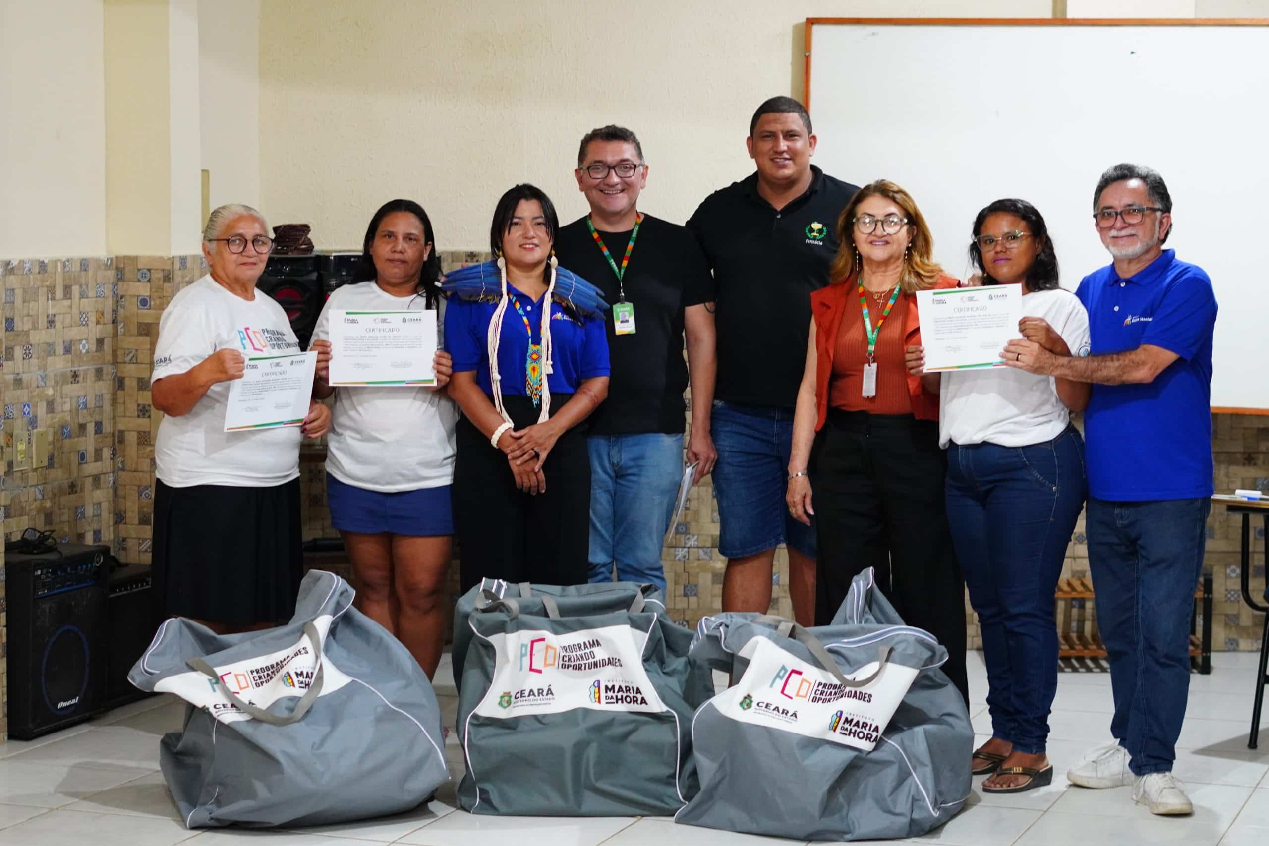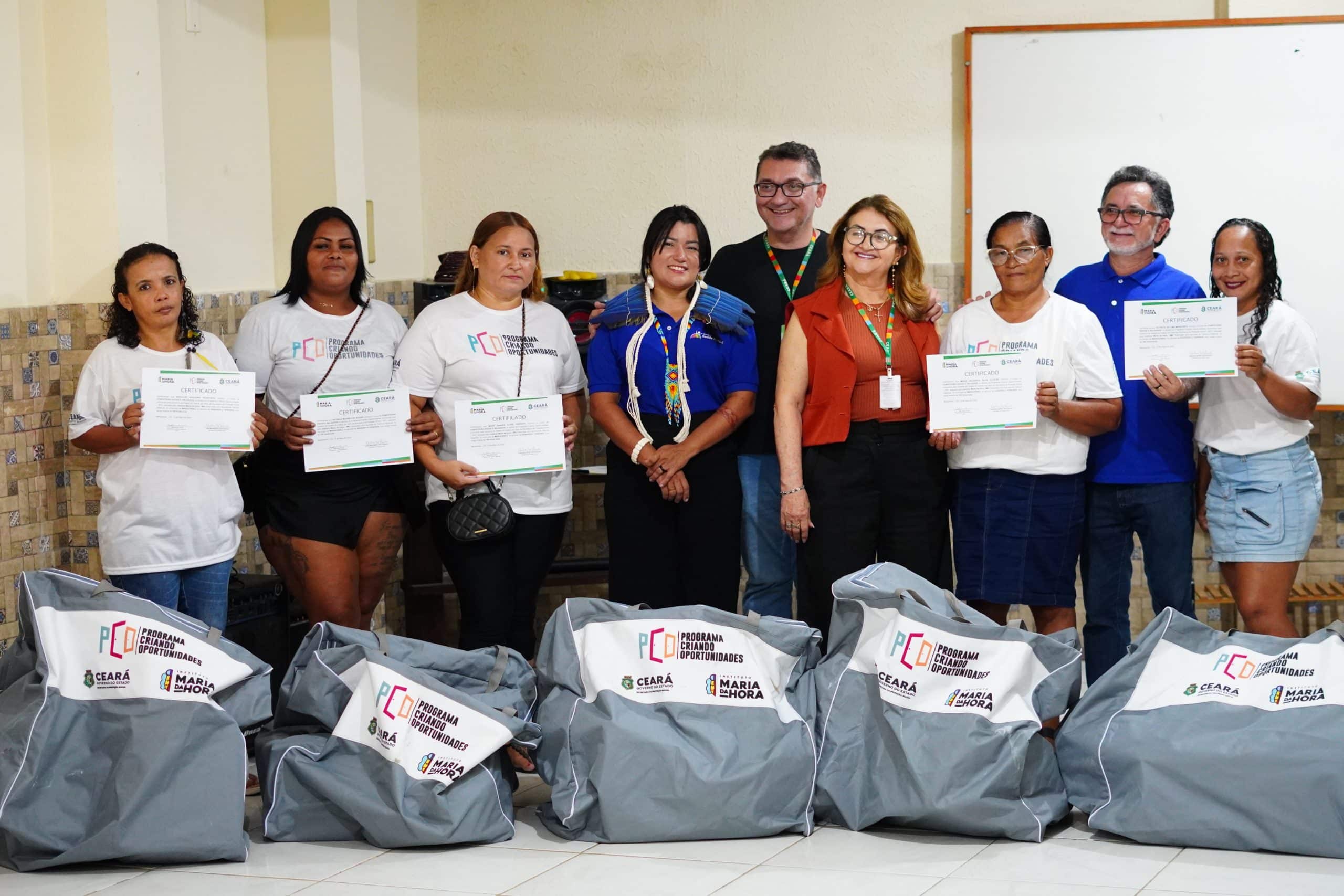Na tarde desta segunda-feira, 01, participantes do Curso de Qualificação Profissional em Confeitaria foram certificados e receberam kits instrumentais com o material necessário para darem o primeiro passo rumo ao próprio negócio. A profissionalização em gastronomia permite que os participantes adaptem suas rotinas e comecem a empreender dentro de seus lares, sendo uma oportunidade de geração de renda para muitas famílias. O curso é uma realização do Programa Criando Oportunidades da Secretaria da Proteção Social do Estado do Ceará (SPS), com aulas ministradas pelo Instituto Maria da Hora. Essa turma teve o apoio do Movimento Saúde Mental (MSM).