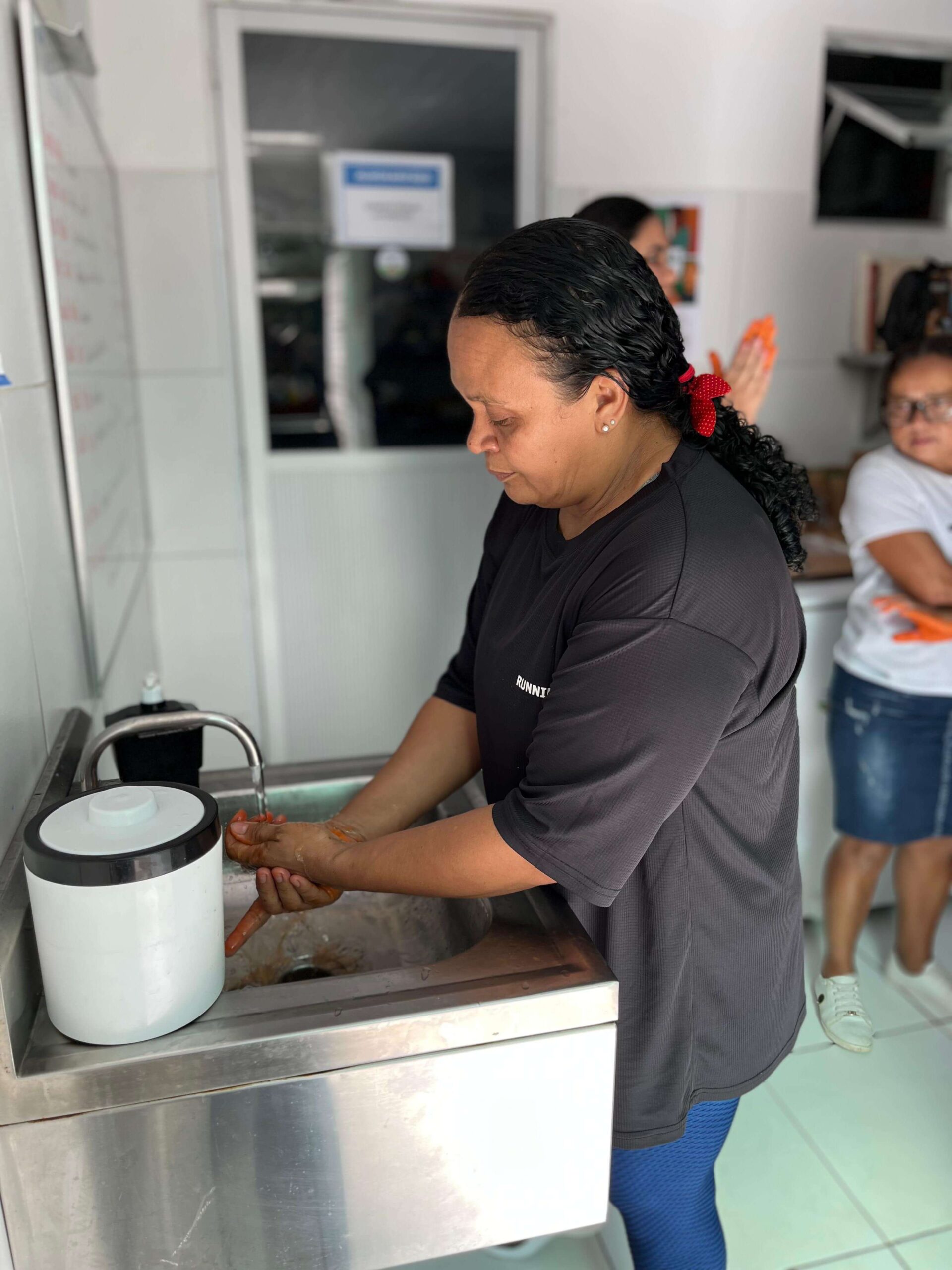 O Gastronomia e Terapia: Caminhos para a Geração de Renda e Autoestima promoveu aula sobre boas práticas de manipulação de alimentos, higiene ambiental, de equipamentos e de utensílios para os/as alunos/as iniciantes do novo semestre de formações gastronômicas. De 9 a 13 de junho, os/as participantes dos cursos Salgados Comerciais, Pâtisserie e Confeitaria, Chocolateria, Doces e Sobremesas para Festas discutiram sobre microrganismos e fontes de contaminação e normas de higiene pessoal e dos manipuladores.
