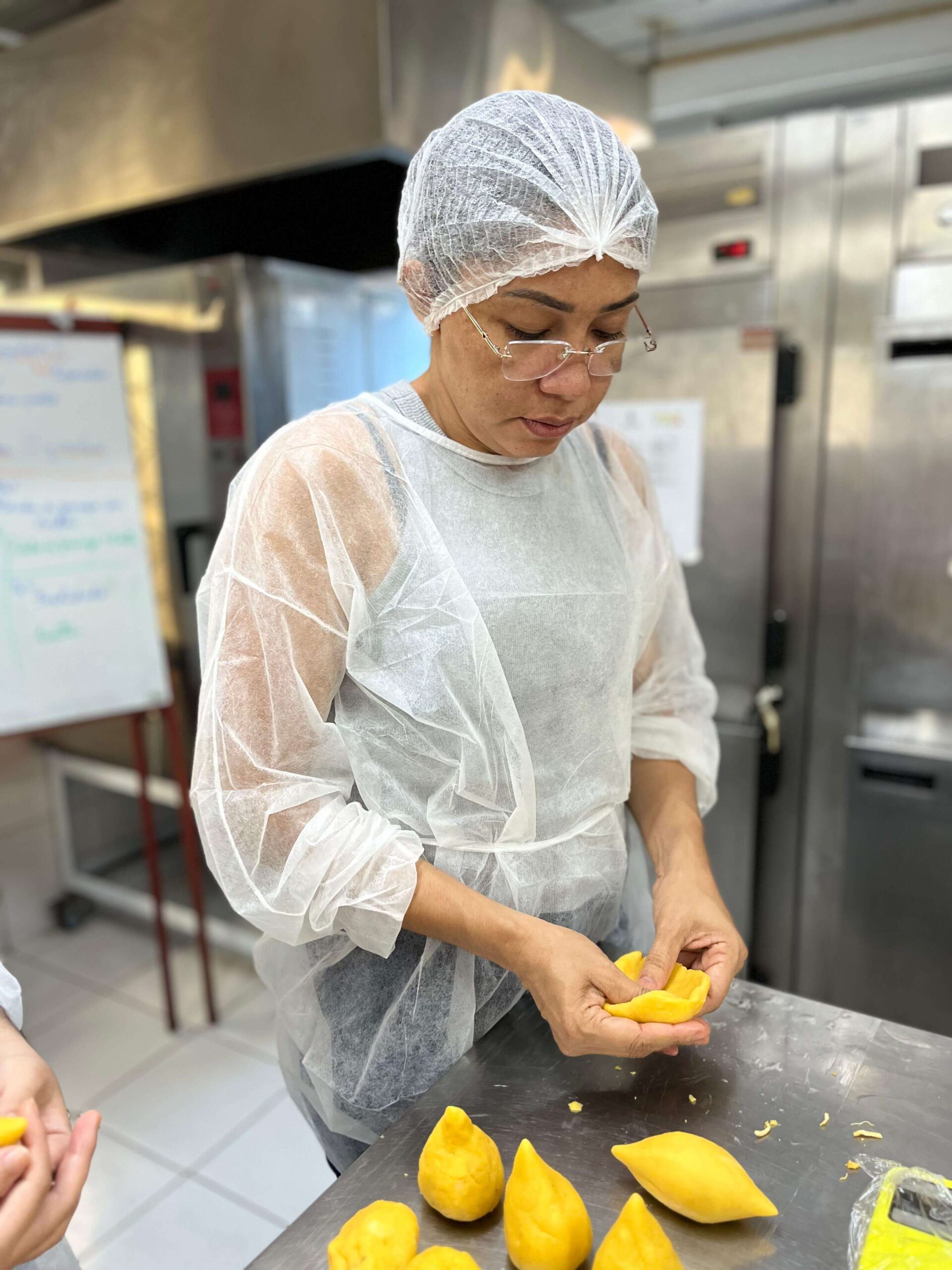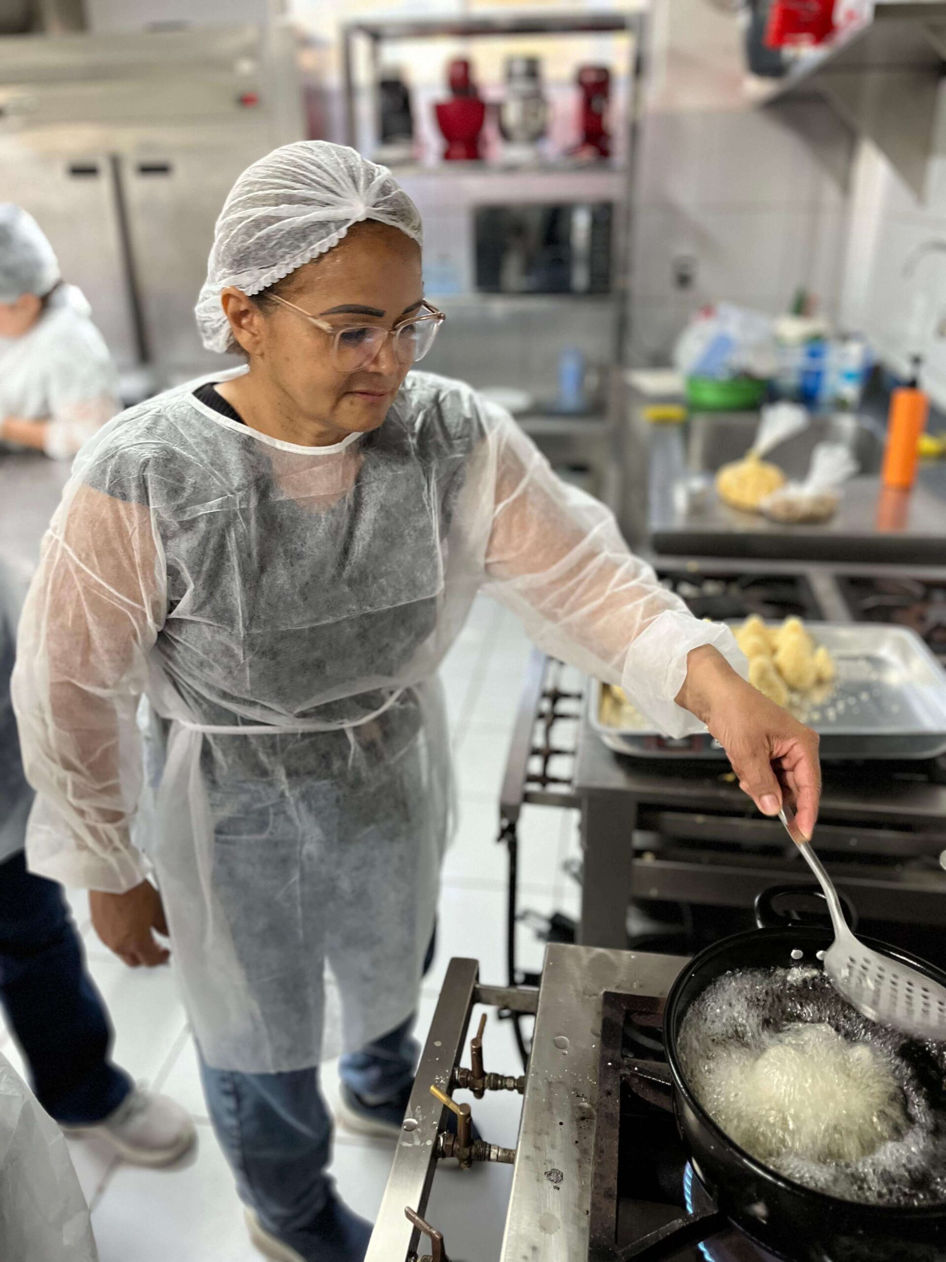 O curso de Salgados Comerciais, do Gastronomia e Terapia, foi destaque da última semana de atividades da Escola de Gastronomia Autossustentável (EGA) pela sua aula de massas cozidas. No dia 15/07, o professor Joel Andrade ensinou para os/as alunos/as o preparo de salgados com massa cozida, detalhando suas modelagens e seus diferentes tipos de líquido base. Ainda em aula, o professor passou técnicas de empanamento, que foram colocadas em prática pelos/as participantes na hora do preparo dos salgados.