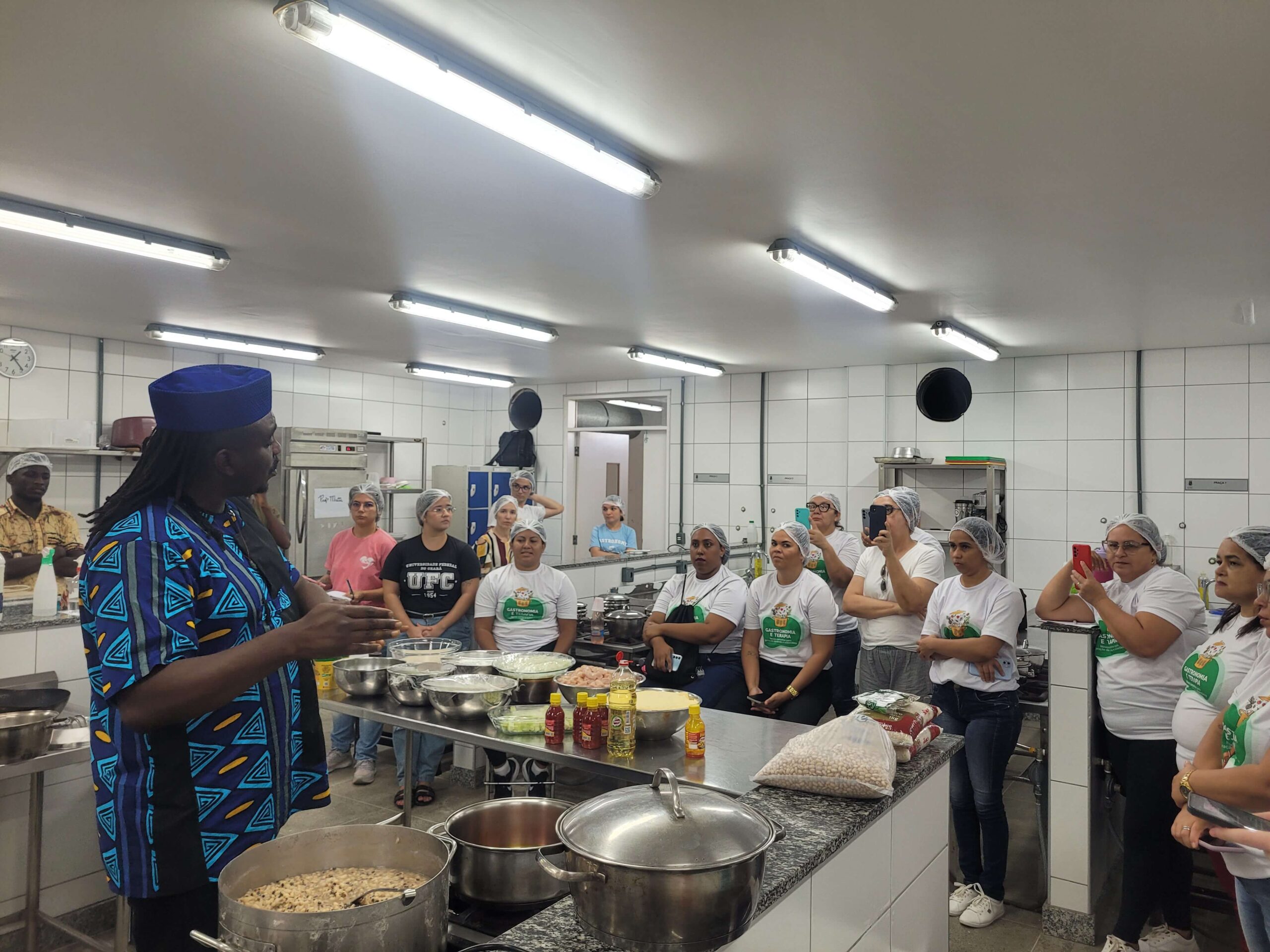 Na última quinta, 24, as turmas de Confeitaria e Chocolateria do Gastronomia e Terapia participaram de uma aula especial sobre gastronomia africana facilitada pelo chef congolês Kimberly. No laboratório de cozinha quente do curso de Gastronomia da Universidade Federal do Ceará (UFC), as turmas comandadas pelas professoras Monaliza Costa e Lauana Fontenele, respectivamente, foram apresentadas a técnicas e pratos típicos do país de origem do chef, que também contou sua história e trajetória na África e no Brasil.