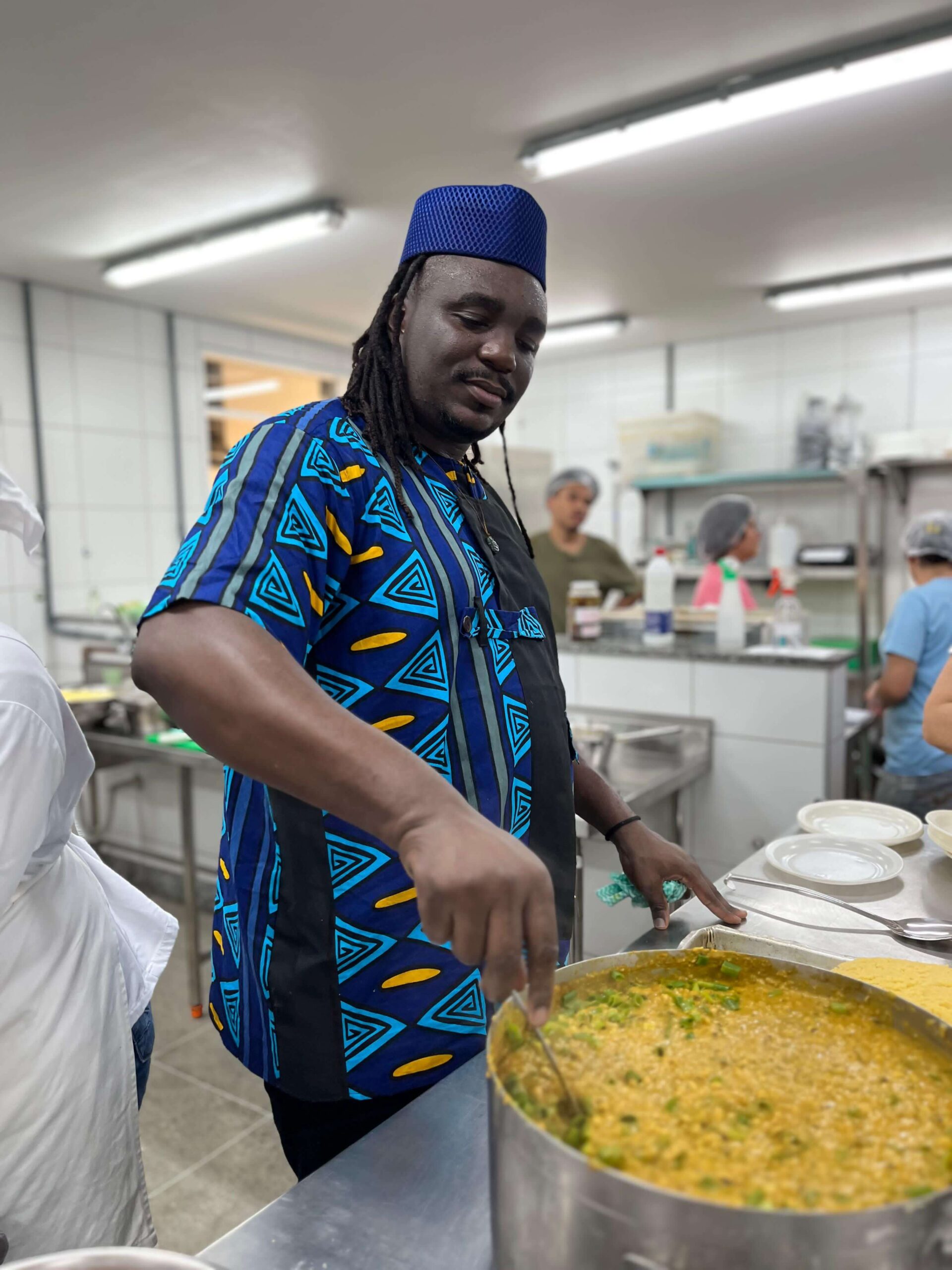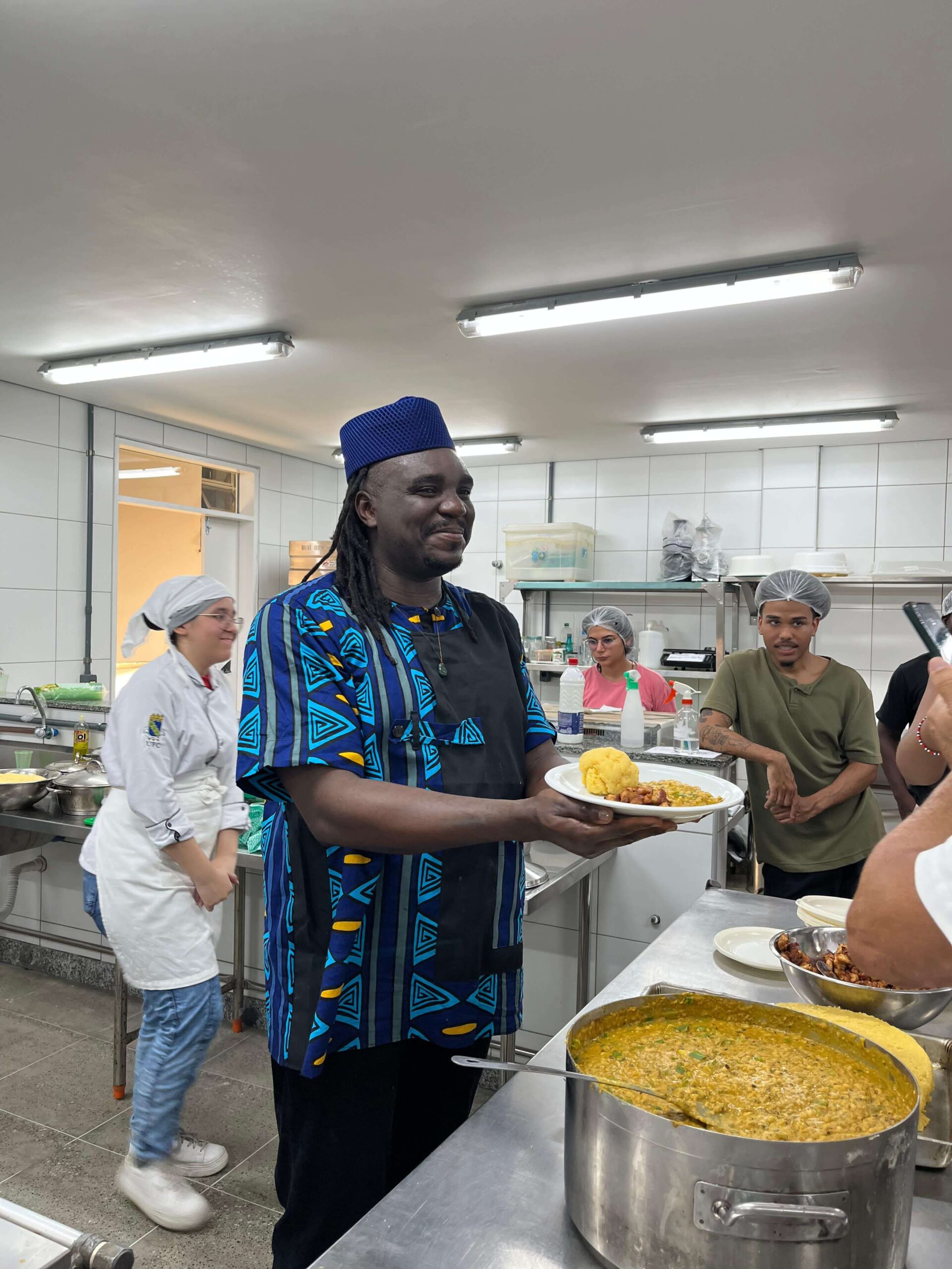 Durante a aula Kimberly preparou Fufu, prato que lembra a polenta brasileira, feito com fubá e farinha de mandioca, além de Mbwengi na awamba, feito com feijão fradinho, legumes refogados com óleo de dendê e pasta de amendoim. Todas as preparações foram servidas com frango frito e ao final os/as alunos/as realizaram a análise sensorial de cada preparo.