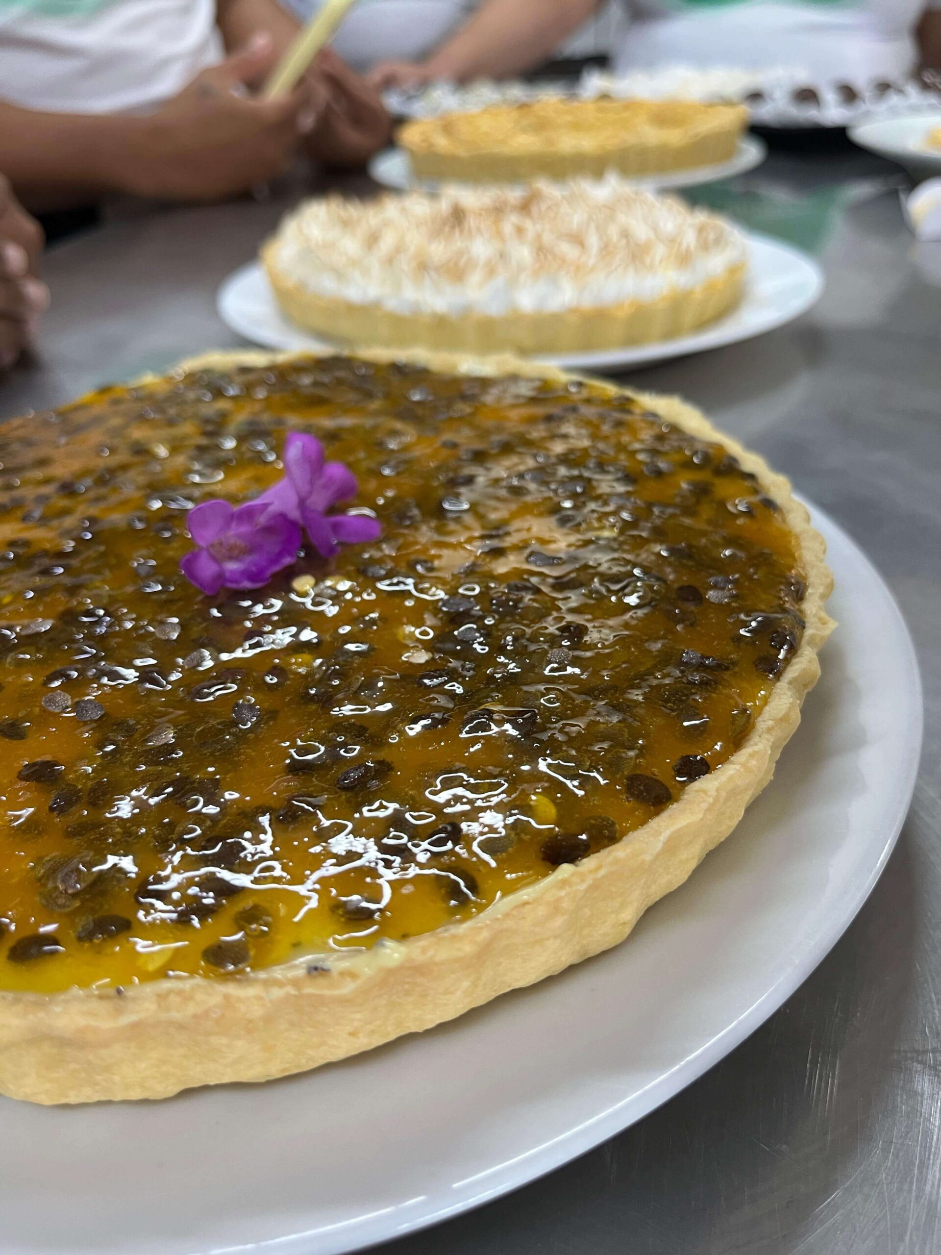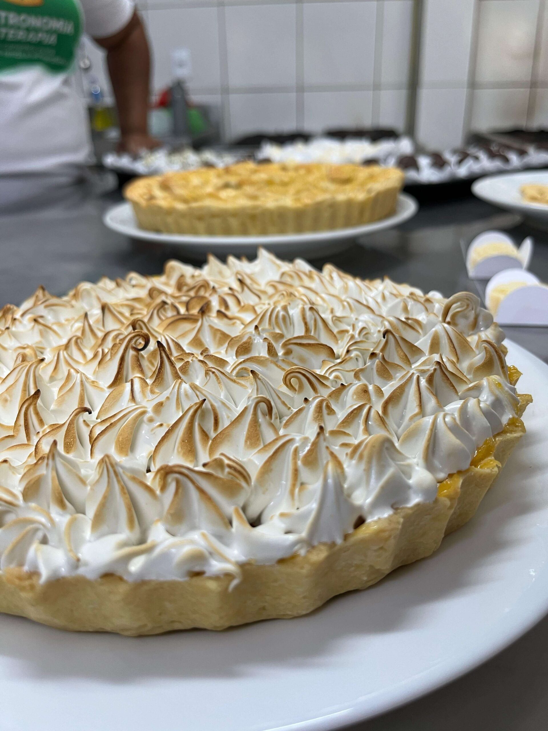 Foram feitas torta de limão com massa sucré, recheio de lemon curd e finalizado com merengue suíço; torta de maçã e torta de maracujá.