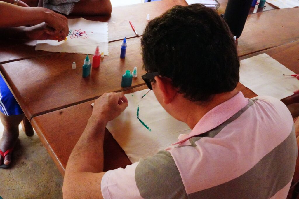 “Um dia desses eu desenhei um tambor, um triângulo… desenhei uma casa também. Dou valor a pintar, mas eu gosto mais é do escalda-pés”, conta F.T, animado ao lembrar as atividades que participa na Palhoça. A arteterapeuta do MSM Joyce Monteiro, que acompanha os residentes em casa todas as terças-feiras, explica que as atividades de pintura e desenho são focadas em trabalhar a questão motora e sensorial de cada participante. Paralelamente, também “são feitas práticas de cuidados como aromaterapia, meditação, escalda pés e reflexologia, para estimular autocuidado e alinhar os sentidos”, destaca.