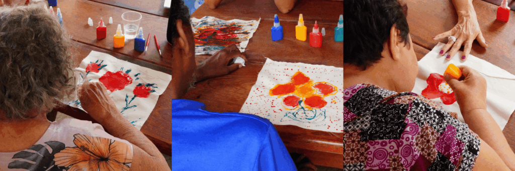 Semanalmente, aqueles/as que possuem uma mobilidade melhor se deslocam até a Palhoça Comunitária do MSM para participar das terapias em grupo e dos cuidados oferecidos. Os que não conseguem sair da residência, participam de atividades realizadas pelos/as terapeutas na própria casa uma vez por semana. “Porque estão acamados ou porque têm outras questões que não permitem que eles saiam, aí a equipe vai até eles”, explica Ana Paula Fernandes, coordenadora da Palhoça.