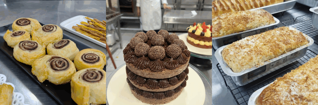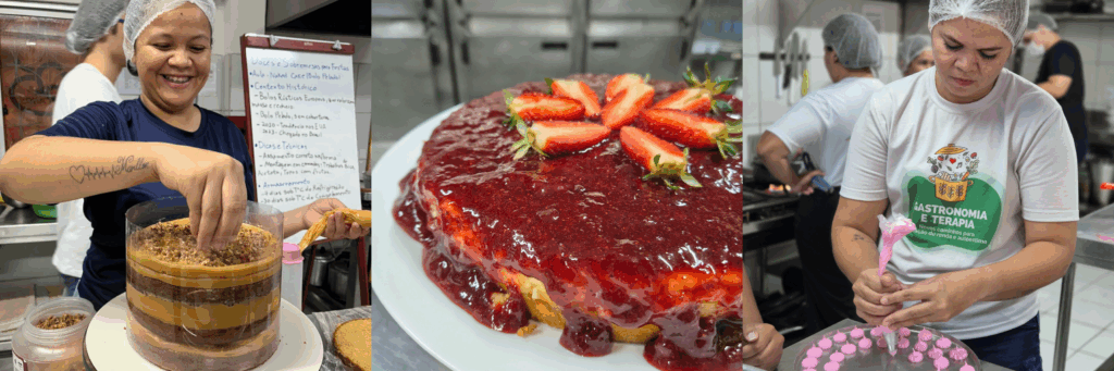 Encerrando a semana, no dia 17 de outubro, a aula de Doces e Sobremesas, ministrada pelo gastrônomo Yan Alves, trouxe um mergulho nos aspectos históricos dos Naked Cakes. Os/as alunos/as discutiram os tipos de embalagens e técnicas de armazenamento, além de colocar em prática o preparo de Naked Cakes de Chocolate, Ninho e Red Velvet. Divididos em equipes, os/as participantes produziram recheios de chocolate, cream cheese e ninho, além de caldas para umedecer os bolos. Em seguida, montaram suas criações, cortando as massas, aplicando as caldas e os recheios, e finalizando com decorações de frutas frescas como uva, acerola e morango, além de brigadeiros. A atividade reuniu técnica, estética e sabor em uma experiência completa de confeitaria artesanal, encerrando com doçura uma semana de intensas descobertas gastronômicas.